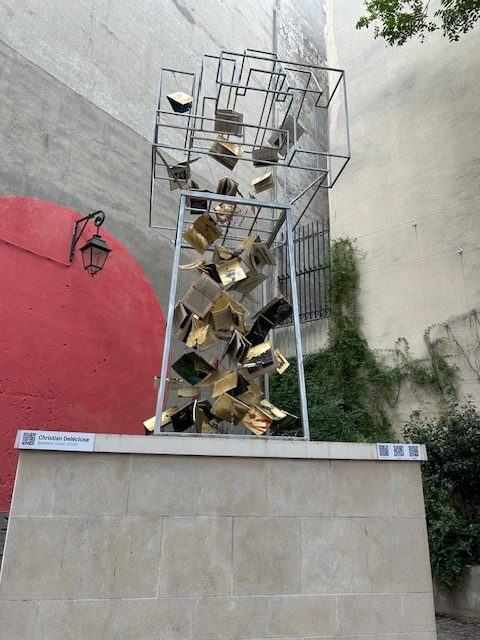 Et la note explicative d’ajouter « ces livres suspendus qui avaient été endommagés par le distributeur ont été au cœur d’un procès… Au lieu d’aller au pilon… ». Ces « invendables » de la maison d’édition Dis-Voir (*) « ont été donnés » à l’artiste parisien plasticien sonore, enseignant/chercheur en architecture et art numériques « Christian Delécluse  » pour qui » leur nouvelle vie surgit, ici, sur l’espace  public. » L’artiste « les a retravaillés (résine et feuille) en dessinant des formes abstraites qui sont autant de pays et de continents imaginaires… ». Suspendus « tels des oiseaux, ils prennent leur envol, à partir d’un nid de culture : le Socle. »