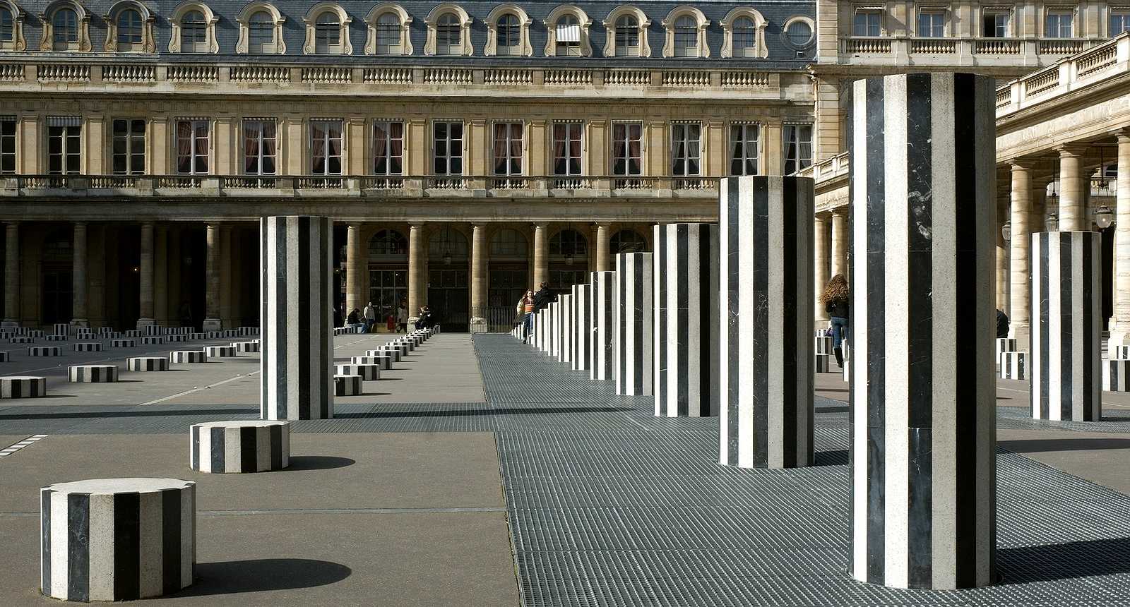 C’est en 1985, il y a 40 ans déjà, que François Mitterrand choisissait parmi les 3 projets présélectionnés que lui présentait Jack Lang, alors ministre de la culture, celui de Daniel Buren (Les Deux-Plateaux) malgré l’avis négatif de la Commission supérieure des monuments historiques et de l’association des amis du patrimoine ou siégeaient de nombreuses personnalités. Ce  projet qui a failli ne pas voir le jour repose sur deux principes selon son créateur  : « Le premier consiste à ne pas ériger de sculpture au milieu de cette Cour d’Honneur comme la tradition le voudrait, mais de révéler le sous-sol. Le second vise à inscrire le projet dans la composition architecturale du Palais-Royal qui est essentiellement linéaire, répétitive et tramée. De la conjonction de ces deux principes, c’est-à-dire de tous les possibles de l’un et de l’autre, sans jamais toutefois qu’ils ne se contredisent ni ne s’annulent, émerge l’œuvre monumentale projetée »…« Les colonnes sont dans des tranchées en référence à l’histoire du lieu, qui fut auparavant, en 1899, transformé en une usine électrique semi-enterrée et dans le but de révéler le sous-sol » dans lequel une fontaine souterraine a aussi été créée. « Sous cette construction, on entend l’eau qui coule : Buren donne ainsi une autre perception du lieu, une perception sensitive. La nuit les colonnes sont éclairées ».