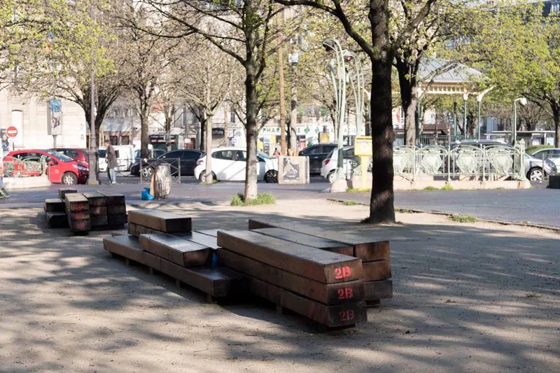 Au-delà du contexte électoral pouvant justifier ce type d’article, le fait que Paris a beaucoup perdu de sa superbe en raison des décisions souvent dogmatiques confondantes et non concertées prises par l’équipe en place est incontestable. La conseillère citée plus haut n’a pas indiqué les bancs « mikado » installés ici et là qui n’étaient que de vulgaires traverses de chemin de fer recyclées empilées (place de la République, devant l’Hôtel de ville…) (voir photo illustrant l’article), les entourages des arbres transformés en petites friches sales et abandonnées entourées de pourtours  faits de bric et de broc comme le sont souvent les jardins partagés très laids. Quid aussi de ces caissons destinés à éviter les vols de bicyclettes ou ces énormes containers de tri dits Trilib, sans oublier nombre de terrasses éphémères bas de gamme… ?