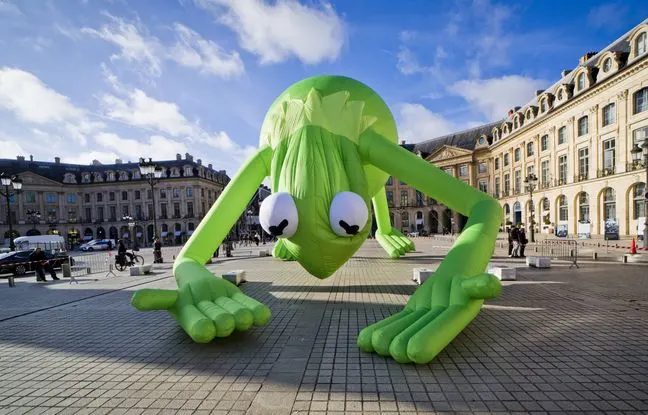 Comment a t’on pu laisser installer sur la place Vendôme une grenouille géante « le derrière en l’air » (karmit dans le muppet show) ? Il s’agit d’une structure gonflée à l’hélium de 20 m de long dite « Star de la foire d’art contemporain Art Basel Paris » (ex FIAC), conçue par l’artiste américain d’origine vénézuélienne Alix Da Corte, qui est installée jusqu’à ce dimanche sur l’une de plus belles places du monde synonyme du luxe à deux pas du Louvre. Déjà à l’occasion de la FIAC, un soi-disant sapin ambigu et suggestif de 24 m avait été érigé sur cette place en 2014, fruit de la réflexion de l’artiste américain Paul McCarty.